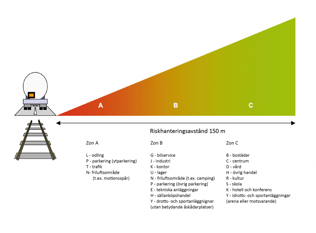 Länsstyrelsen rekommenderar att kommunerna tillämpar ett riskhanteringsavstånd på 150 meter från vägen eller järnvägens kant. Avgörande för vilken markanvändning som kan tillämpas inom riskhanteringsavståndet är vilken riskbild som råder i det aktuella området. Det innebär att planarbetet bör inledas med en riskbedömning så att de lokala förhållandena identifieras. Riskhanteringsavståndet delas upp i tre olika zoner med flytande gränser. I zon A, närmast transportleden, kan markanvändning som odling, parkering, trafik etc accepteras, i zon B kan t ex industri, kontor, parkering och sällanköpshandel accepteras och i zon C längst bort från leden men inom riskbedömningsavståndet kan bostäder, skolor, vårdbyggnader etc förläggas.