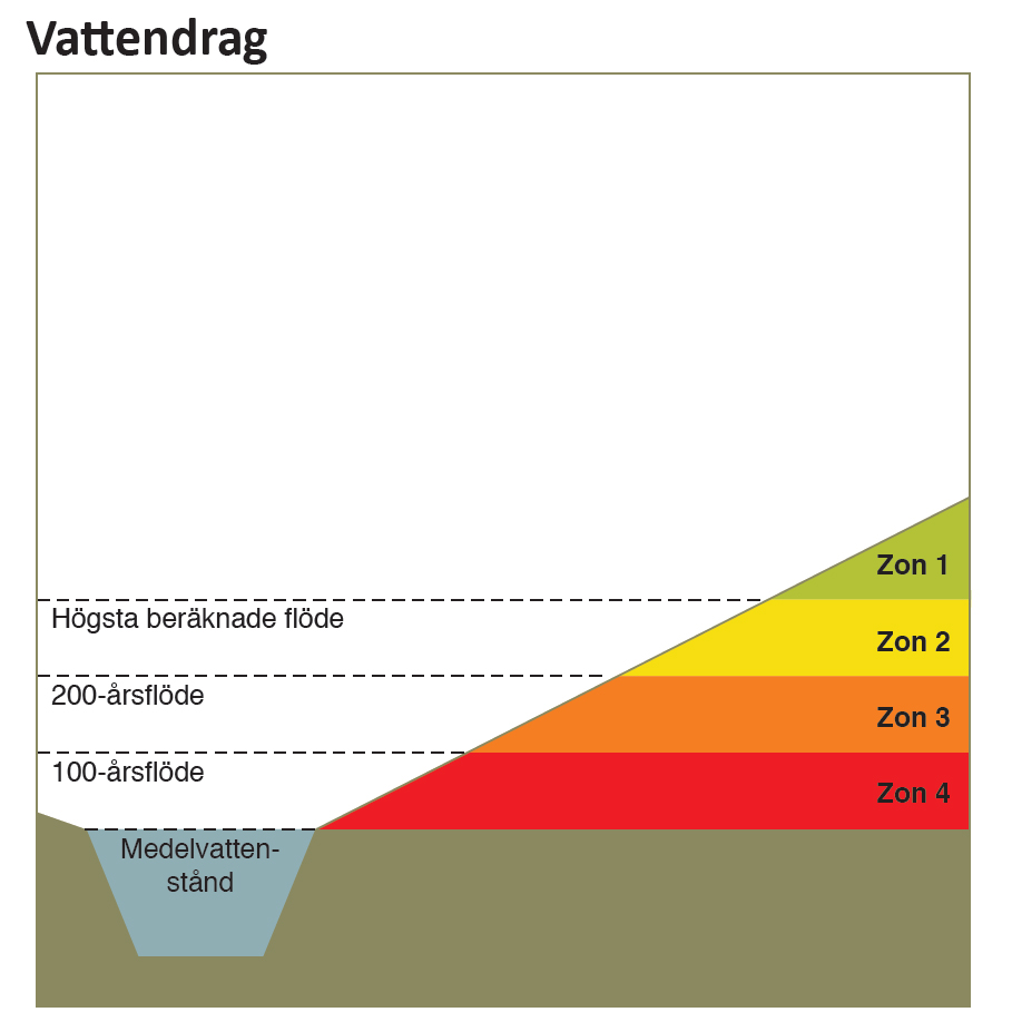 I områden som hotas av det klimatanpassade 100-årsflödet bör det inte tillkomma någon bebyggelse alls. Undantag för enkla byggnader som garage och uthus om fastighetsägaren tar på sig räddningsansvaret vid översvämning, funktioner av mindre vikt och parkeringsplatser, uppställningsytor, vägar med alternativa förbifartsmöjligheter om riskreducerande åtgärder vidtas. Grönytor, vegetation och våtmarker, jord- och skogsbruk, parker och rekreationsområden, sport- och fritidsaktiviteter (utomhus) tillåts.
